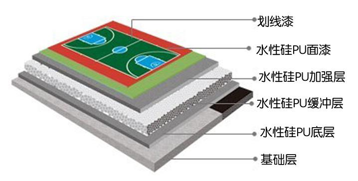硅PU是一種符合人體工學原理并滿足運動物理特性需要,具備上硬下彈結構特征并能直接在水泥或瀝青基礎上施工的健康型專業(yè)彈性合成球場面層材料系統(tǒng),以單組份有機硅改性聚氨酯組成緩沖回彈結構,雙組份改性丙烯酸作為耐磨面層。